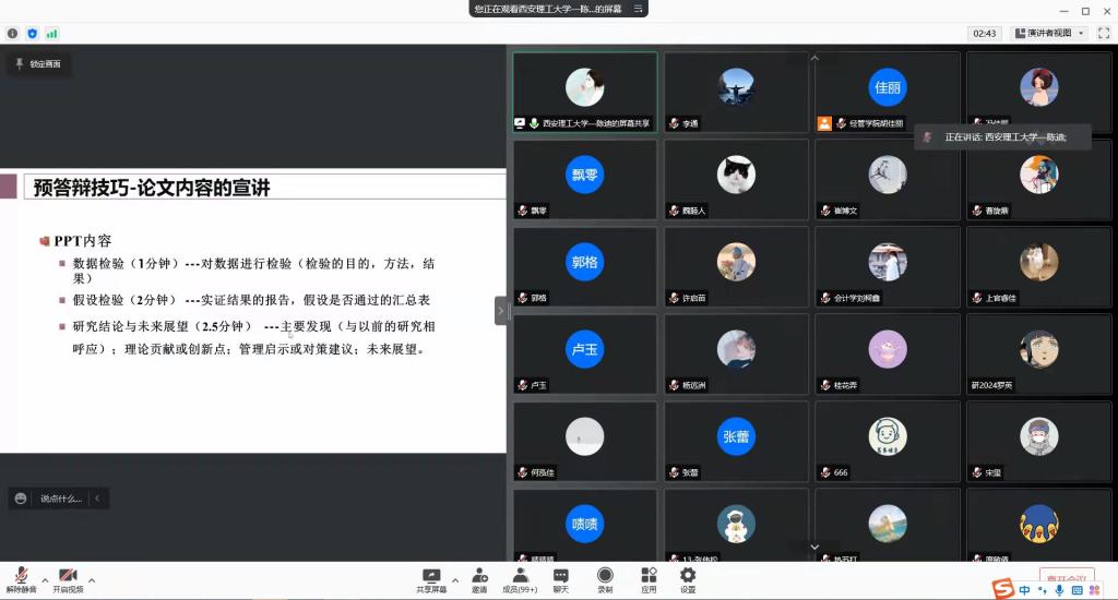 本次公开课以硕士三年级员工的预答辩、二年级的开题答辩指导及论文撰写为主要内容。陈迪细心向大家讲解了预答辩的技巧及注意事项,重点分享了PPT制作的要点,并提出了通过多种途径记录老师所提的问题的建议,从而为后期正式答辩和盲审的顺利通过做好准备;乔建麟以“研究方法及其如何应用?”“如何去分析数据?”等5个问题入手,对开题答辩进行了详细的讲解;尚宴莹为大家介绍了多个查找文献的渠道,鼓励大家在选择题目时多与导师交流沟通,并对写作小论文和发表论文流程进行了重点分享。