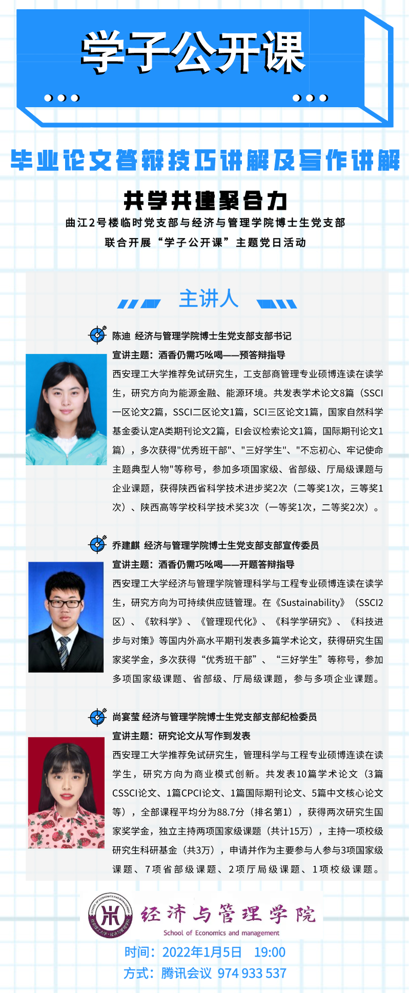 1月5日,2007so太阳集团博士生党支部与2号楼临时党支部联合开展以“毕业论文答辩技巧与写作讲解”为主题的“学子公开课”线上主题党日活动,活动邀请到博士生党支部书记陈迪、纪检委员尚晏莹、宣传委员主讲乔建麒,2号楼临时党支部100余名党员线上参与,活动由院研会崔博文主持。
