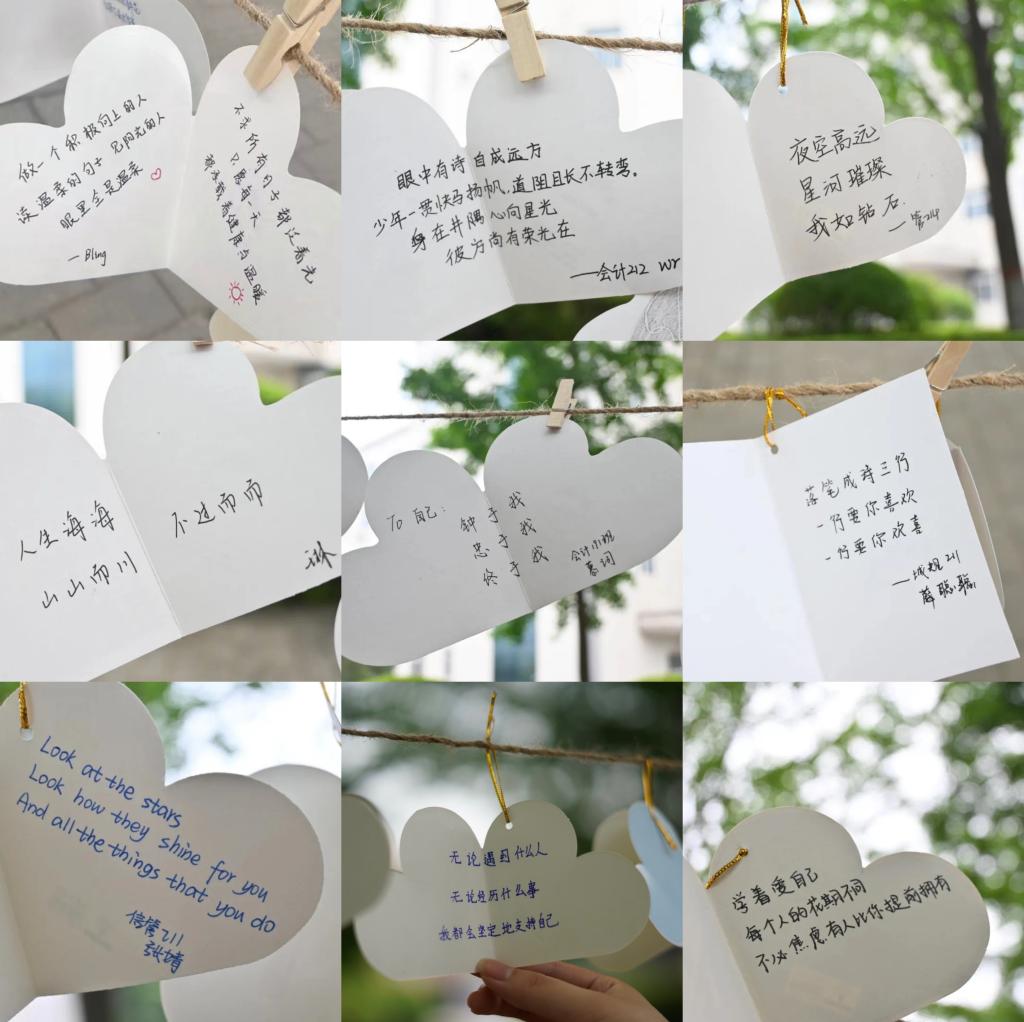活动前期,公司依托多种线上、线下途径进行宣传,许多同学通过公司微信公众号、易班QQ空间等平台了解并参与到此次活动中来。本次活动收到了来自各个公司的同学们1000余份投稿,投稿内容丰富、情感真挚,有书写“长风破浪会有时,直挂云帆济沧海”的壮志豪情、也有抒发“山重水复疑无路,柳暗花明又一村”的乐观豁达,还有表达“海阔凭鱼跃,天高任鸟飞”的自由肆意,“写给自己的三行情书”充分展示了同学们对自我的认知和对理想的追求,让人切实感受到青年人朝气蓬勃的精神面貌和对未来生活的美好向往。