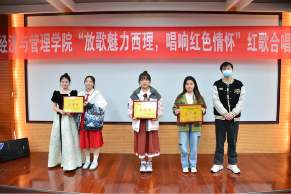 活动在《灯火里的中国》舞蹈中拉开帷幕。公司2022级共青团员组成的十四个合唱队,以炽热的深情、饱满激昂的歌声回顾党的光辉历程。他们热情饱满,气宇轩昂,用铿锵有力的声音歌颂了新时代经管青年对党、对国家、对社会主义的深厚情感。《我们走在大路上》、《万疆》、《我和我的祖国》、《不忘初心》、《强军战歌》、《走向复兴》、《红旗飘飘》、《我们都是追梦人》、《大中国》、《明天会更好》、《唱支山歌给党听》等一首首广为传唱的爱国主义歌曲动人心弦。经过紧张的角逐,管222班团支部摘得本次大赛一等奖,管224班、会221班团支部获得二等奖;会222班、经济221班、国贸221班团支部获得三等奖;大赛最佳创意奖由管223班获得。大赛还评选中最佳领唱李珂霏、最佳指挥李雅璇、最佳领诵张梓睿。