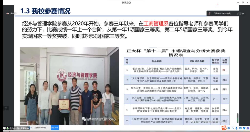 岳英从关于比赛、比赛规则、参赛方式等几个方面进行了讲解。在关于比赛方面,她详细讲述了比赛背景、意义及重要性,并分享了公司往届优秀参赛队伍,鼓励同学们树立竞赛自信。她从个人理论知识测试、选题、校赛、省赛、国赛和两岸及港澳调查大赛六项做出详细分析,用详细的数据呈现市场调查与分析大赛的打分表及奖项设置,使同学们更详细的了解比赛,最后为大家介绍了比赛参与流程,并提出品牌和高质量发展研究中心将为同学们提供参赛帮助。