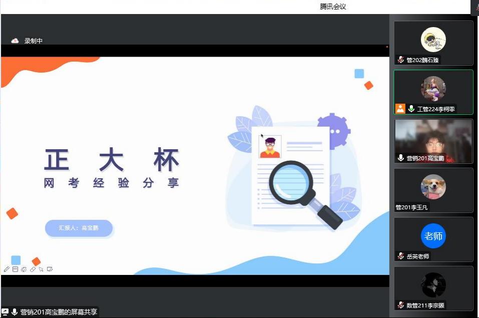 高宝鹏从参赛员工角度为同学们做分享。他从题型与分值对比、自身参赛经验为同学们做出赛前准备的讲解,并就比赛过程中答题技巧等方面提出了一些经验,也从考后的各项情况做出分析,鼓励通过的同学继续加油,未通过的同学也不要气馁继续努力,步步为“营”研学社也将为感兴趣的同学提供一个学习、不断提升自我的机会。