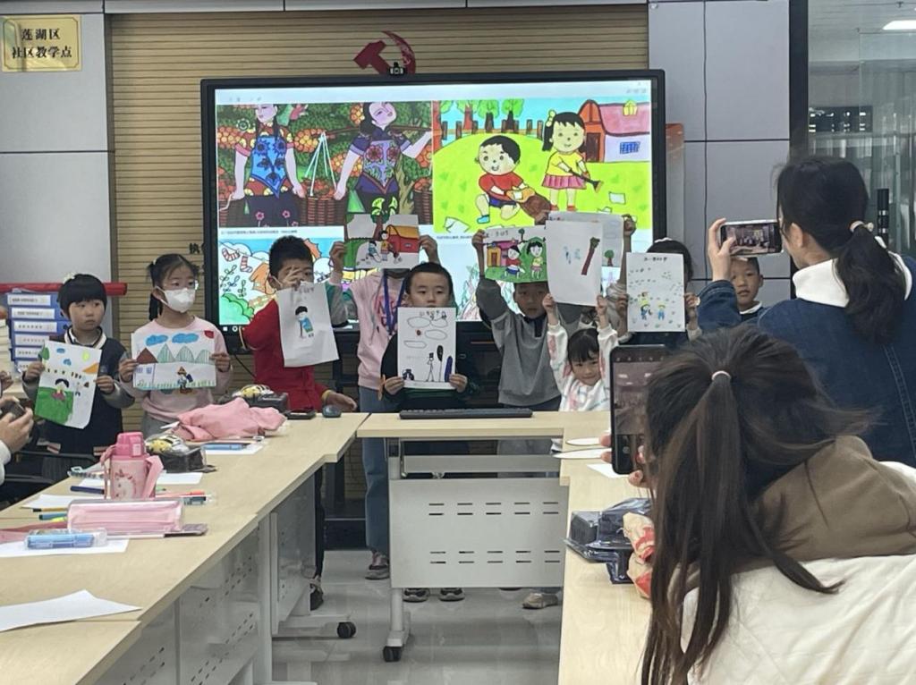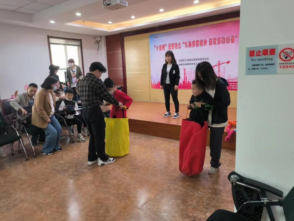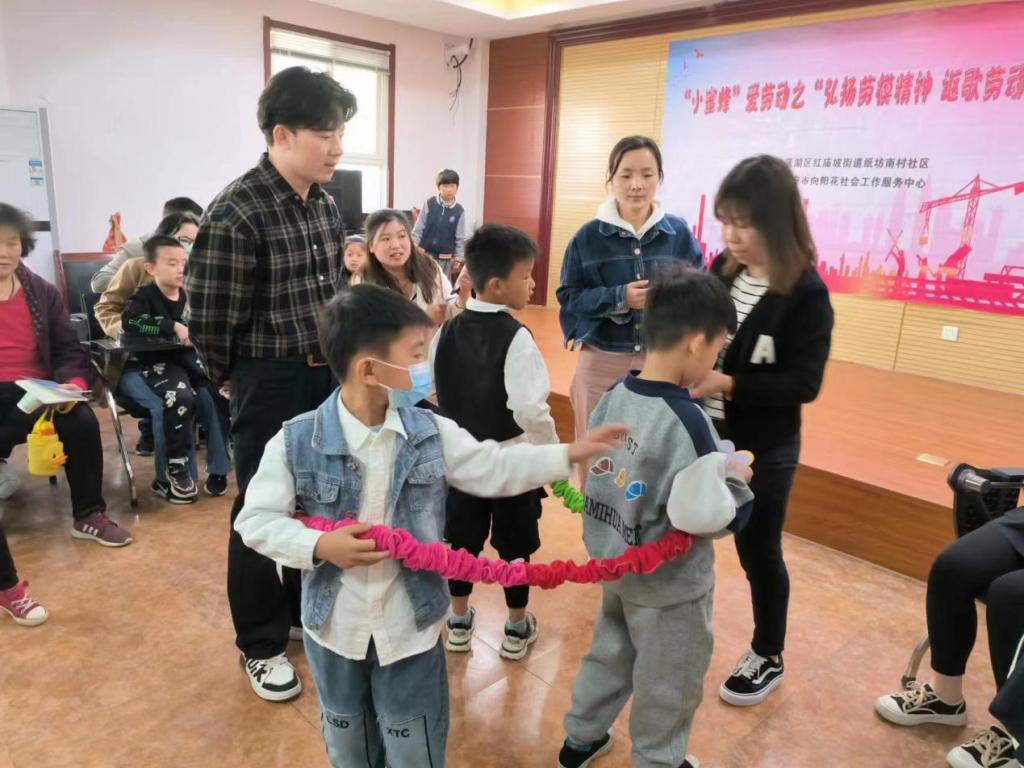 此次志愿者服务活动以关爱劳模,树立学习思想,培养劳动品质为主题,志愿者负责配合活动组织,参与并示范活动环节,纸坊南村10余名小朋友及其家长与志愿者共同参加。活动开始,由当地社区负责人致辞,接着进行了袋鼠跳摸小麦水稻和三人拉力绳贴爱心等游戏,小朋友们都积极参与,活力十足。随后,大家跟随负责人一起观看了‘五一劳动节的来历’和‘劳模袁隆平爷爷’的视频,并进行了有奖问答,负责人和志愿者带领小朋友们进入最后的对心中的劳模画像环节。