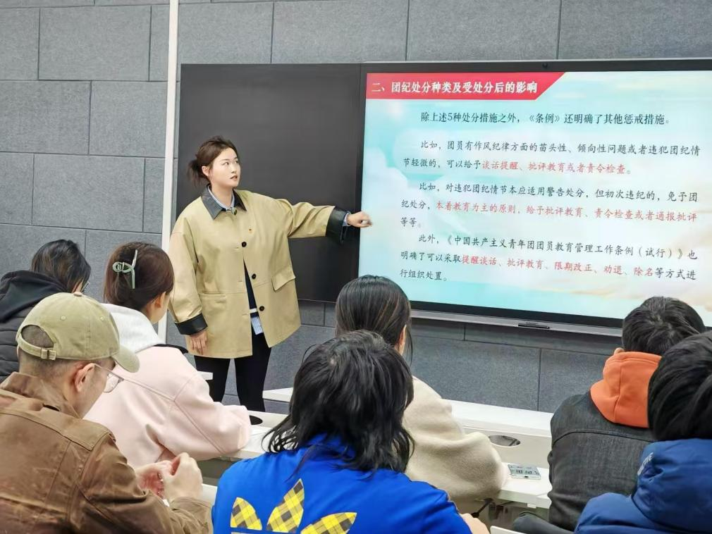 闫如玉领学《中国共产主义青年团纪律处分条例(试行)》。徐文哲向大会报告团员和青年主题教育专题组织生活会查摆问题改进落实的情况报告。团支部18名成员按照要求,既肯定成绩,又直指问题,以解剖麻雀的精神、“揭短亮丑”式的批评和自我批评。评议环节,团支部采取民主集中制的形式,通过“个人自评-团员互评-支委点评”的三级评议机制,现场发放测评表18张,最终评定优秀团员6名,合格团员12名,实现政治体检全覆盖。会议最后,荆霄进行总结点评。她讲到国贸231团支部工作“有亮点、有深度、有潜力”,尤其在思想引领与学风建设方面成效显著,给予了充分肯定。同时也提出三点期望:一是团员需要明确身份,根据团纪严于律己;二是要求全体团员珍惜环境、抓住机会,深化理论学习与专业实践的融合,增长才干;三是希望支部委员带头挖掘支部特色,协同构建更优秀的团支部。