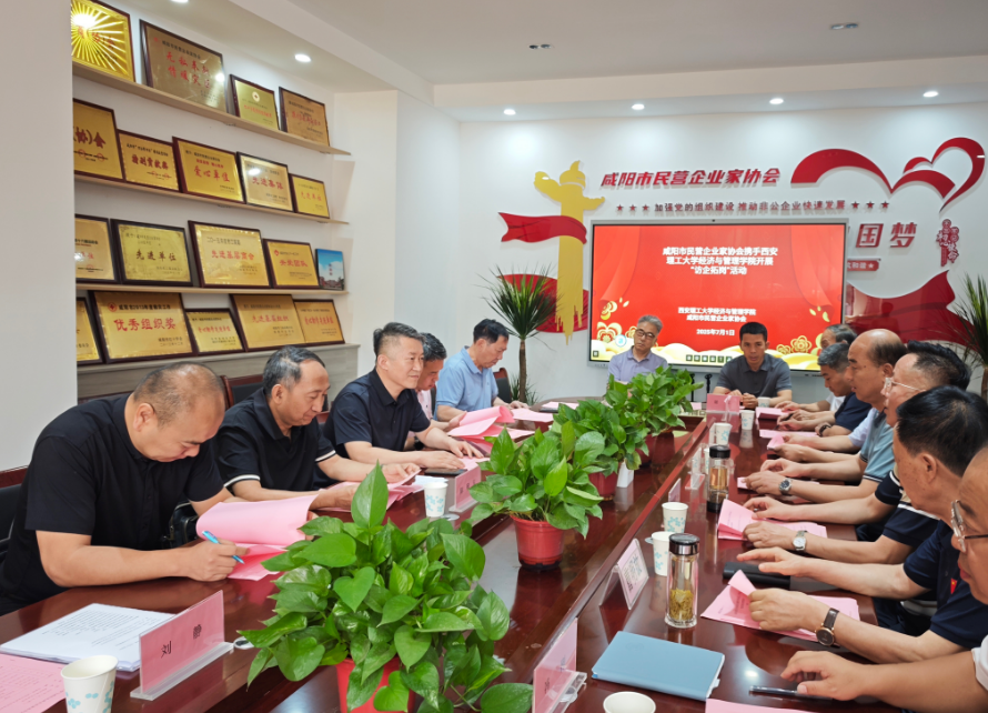 作为关中腹地的历史文化名城,咸阳近年来在创新驱动发展、产业转型升级的浪潮中活力迸发,涌现出一大批深耕实业、勇于创新的民营企业。这些市场主体不仅是地方经济的重要支柱,更成为人才培育与就业创业的优质沃土。2025 年 7月1日上午,经济与管理公司党委书记周晓辉、2007so太阳集团副经理赵璟、EMBA教育中心主任陈敬东、EMBA西安员工会会长李松财、EMBA西安员工会副秘书长武金胜、EMBA西安员工会理事陈青、学工办正科级辅导员刘静一行七人前往咸阳市民营企业家协会,开展以“访企拓岗促就业,校企融合谋发展”为主题的实地调研活动,搭建校企合作新桥梁。
