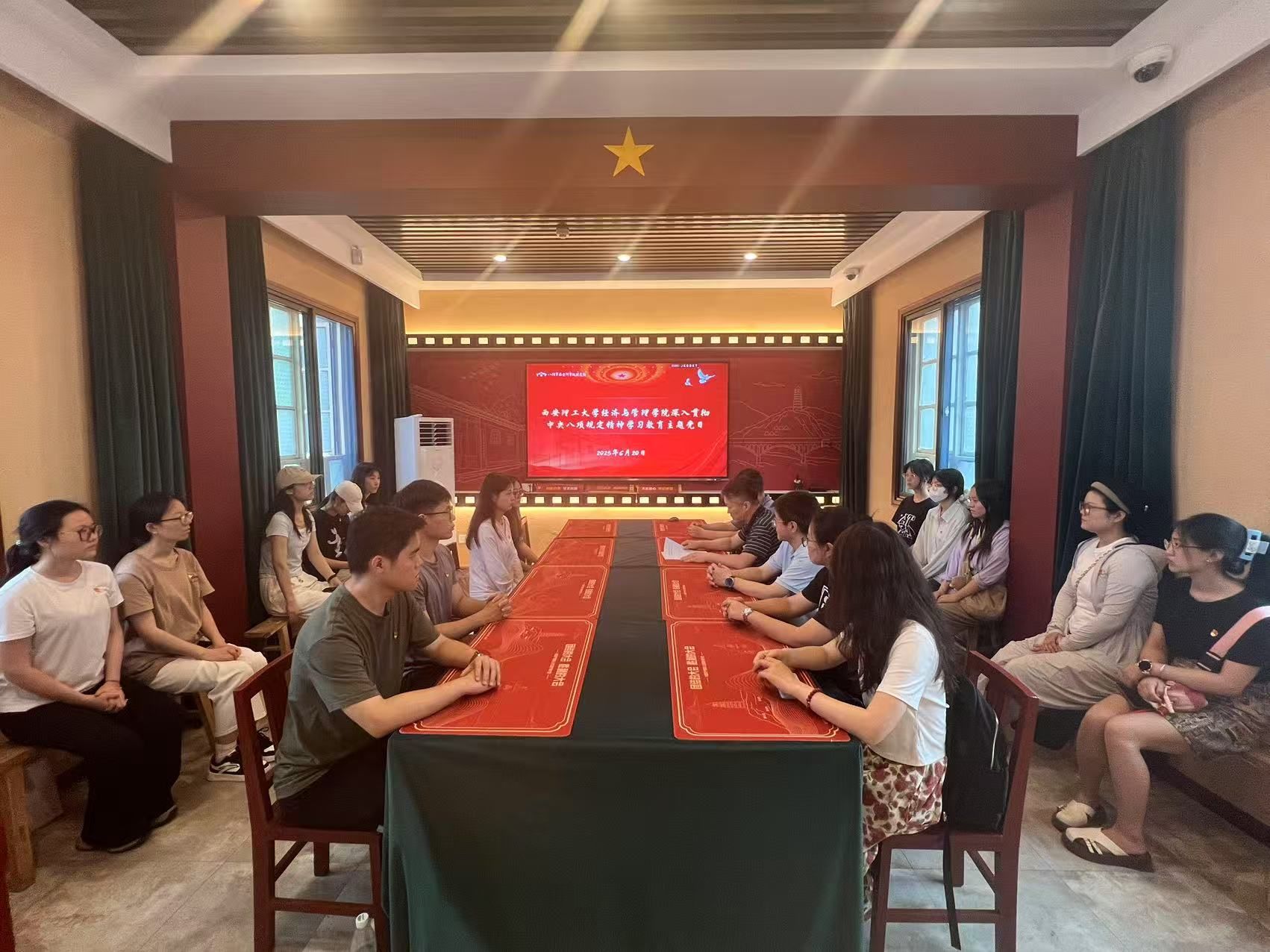 为强化师生历史记忆、缅怀革命先辈、赓续红色血脉、筑牢信仰根基,深入贯彻中央八项规定精神学习教育实效,在庆祝建党104周年之际,经济与管理公司党委于6月20日下午组织师生党员赴八路军西安办事处开展实践研学活动。本次活动通过“沉浸式参观+誓言重温+专题领学”三重维度,将革命传统教育与作风建设有机结合。