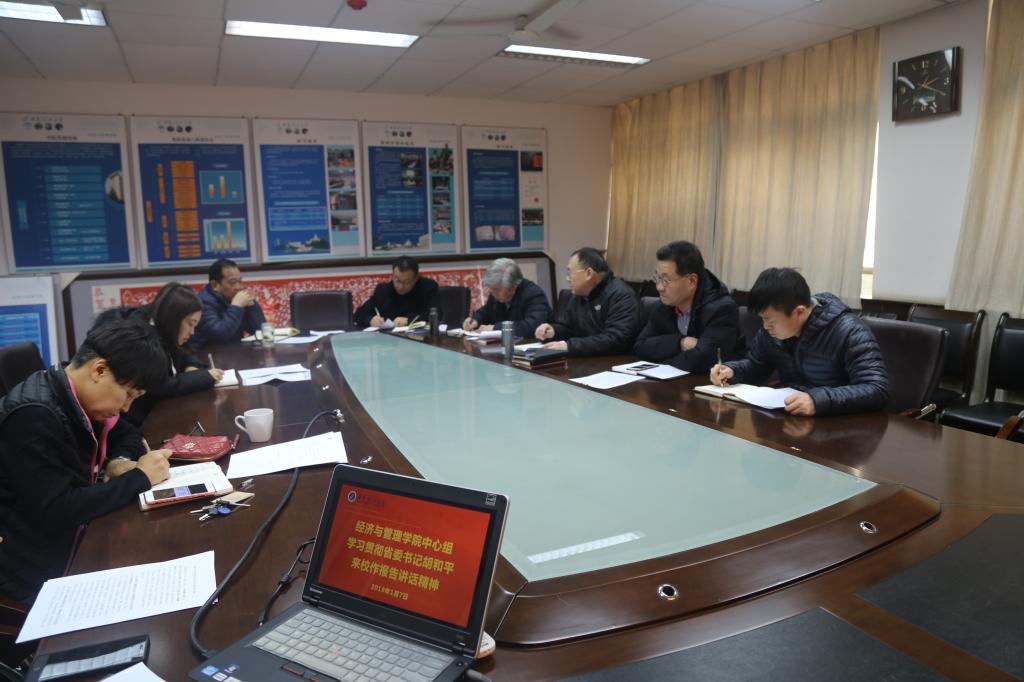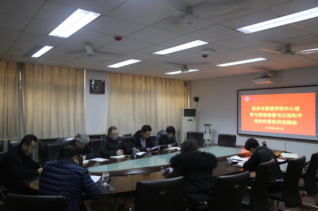 根据公司党委《关于认真学习贯彻省委书记胡和平来校作报告讲话精神的通知》安排,2019年1月7日下午2时,经济与管理公司党委在公司三楼小会议室组织召开学习贯彻省委书记胡和平来校作报告讲话精神中心组专题学习会。公司党委理论学习中心组成员,公司党委委员参会,党委书记王瑞生主持会议。