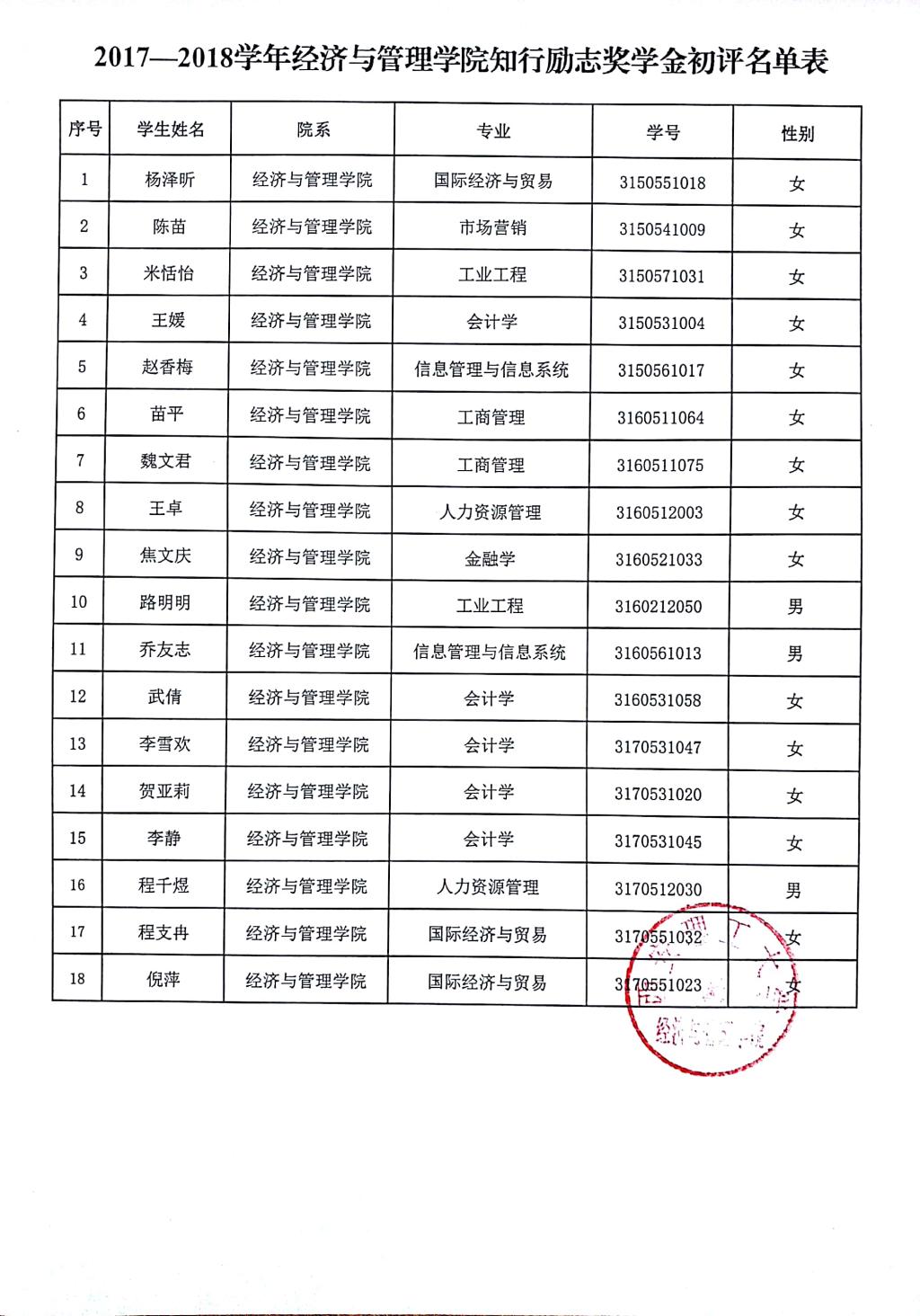 2017-2018学年知行励志奖学金初评名单公示