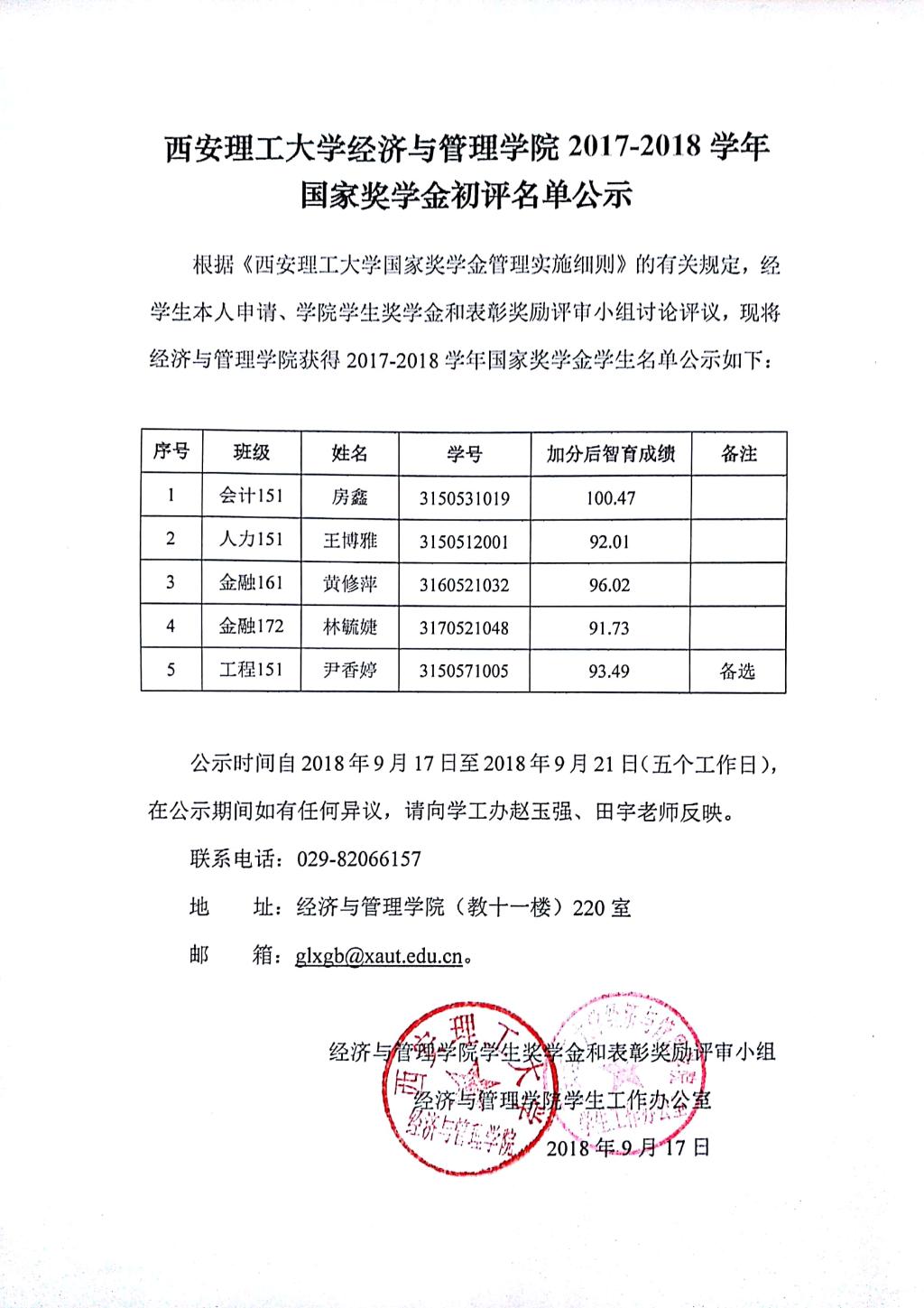 2017-2018学年国家奖学金初评名单公示