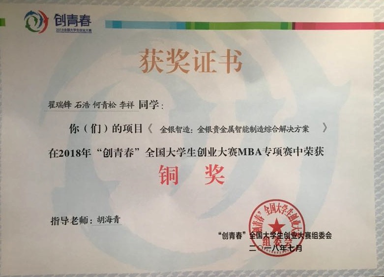 2018年7月13日-15日,由共青团中央、教育部、人力资源和社会保障部、中国科协、全国学联、浙江省人民政府主办,共青团浙江省委、金华市人民政府、浙江师范大学承办的2018年“创青春”全国老员工创业大赛MBA专项赛和网络信息经济专项赛在浙江省金华市举行终审决赛。经过网络评审、现场答辩和集中评议等环节,公司参赛项目“金银智造:金银贵金属智能制造综合解决方案”获得MBA专项赛铜奖,取得了公司在该类赛事的最好成绩。本次比赛由2007so太阳集团团委书记朱晓明带队,指导老师胡海青和项目组成员翟瑞锋、李祥共同参加了比赛。
