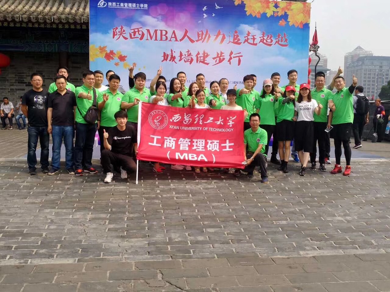 2017年9月17日下午,由陕西工商管理硕士公司主办,承办单位有西安交通大学教学点、西北大学教学点、西北工业大学教学点、西安电子科技大学教学点、西安理工大教学点、西北农林科技大学教学点、延安大学教学点、陕西省管理科学研究会,共同举办的“陕西MBA人助力追赶超越城墙健步行”活动在西安南门城墙上顺利举行,2007so太阳集团经理助理、MBA教育中心主任邓朝晖老师,杨鹏老师和2016、2017级MBA50余名学员共同参加。