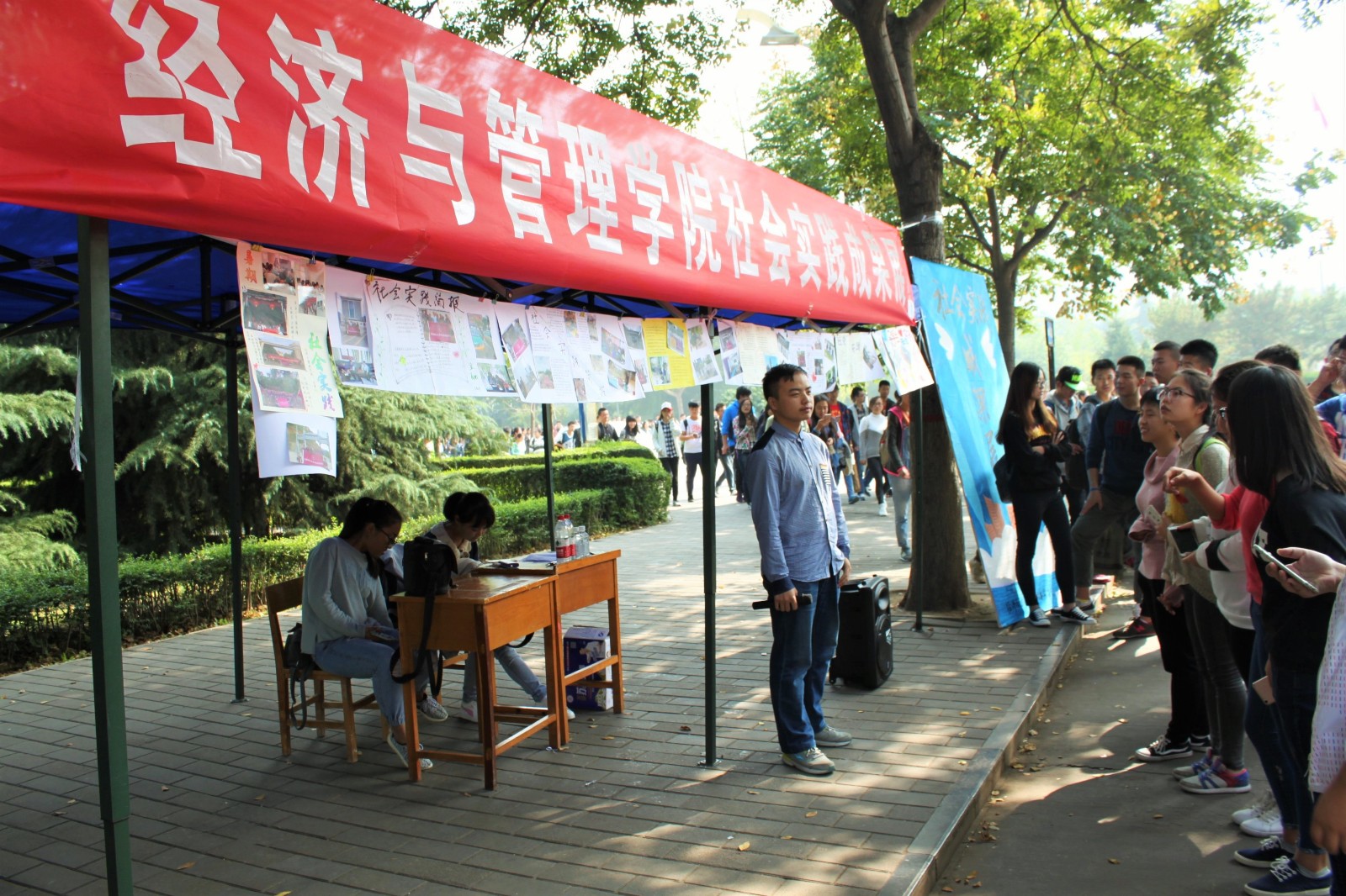 大学是一段特别的人生历程,踏上这段历程的同时,也要用心去欣赏周围多姿多彩的风景。同学们兴趣浓厚,细心的倾听讲解,认真的阅读展报,将展示区域的帐篷围得水泄不通。了解社会实践活动参与者们的经历,也体味他们的心得与感悟,从中领略社会实践之于老员工的重要意义。