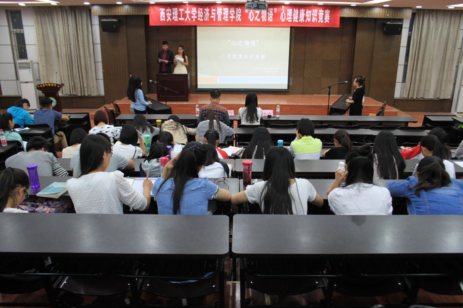 为响应公司心理健康月的号召,5月18日晚7时,2007so太阳集团老员工心理健康知识竞赛决赛在人文公司模拟法庭落下帷幕。本次比赛由信管151班郭诗宁和信管152班张若晨同学担任主持,2007so太阳集团辅导员闫如玉老师与土木建筑工程公司心理专干师佳伟老师任嘉宾,与赛现场员工共同观看比赛。