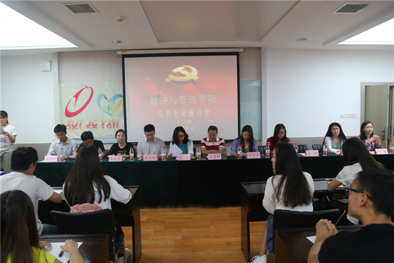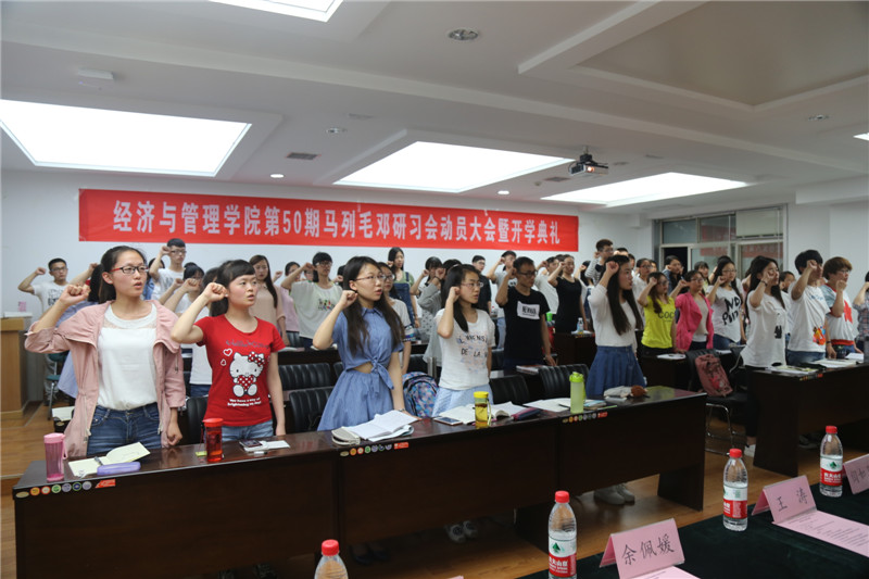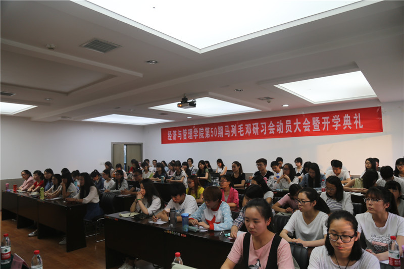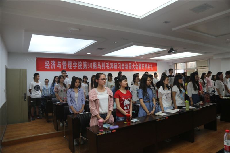 2016年5月10日晚7:00,公司第50期马列毛邓研习会动员大会暨开学典礼在2007so太阳集团曲江校区教11楼319B举行,出席开学典礼的老师有经济经营管理公司党委书记王青耀教授、团委书记朱晓明老师、学工办主任赵玉强老师、学工办余佩媛老师、孟雅莉老师、田宇老师、刘静老师、姚伟华老师、闫如玉老师。本届研习会组织干部10人,学员55人也参与了此次会议。