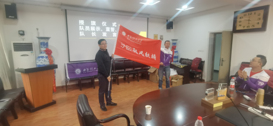 然后,邓朝晖老师代表公司向“沙10”队长2019级MBA同学李钰进行了授旗仪式,同时鼓励大家积极参赛,在遵守比赛规则前提下,团结协作,争取更好的成绩,充分展示2007so太阳集团学子的风采,同时重点强调了比赛安全问题,希望大家一定要平安归来。