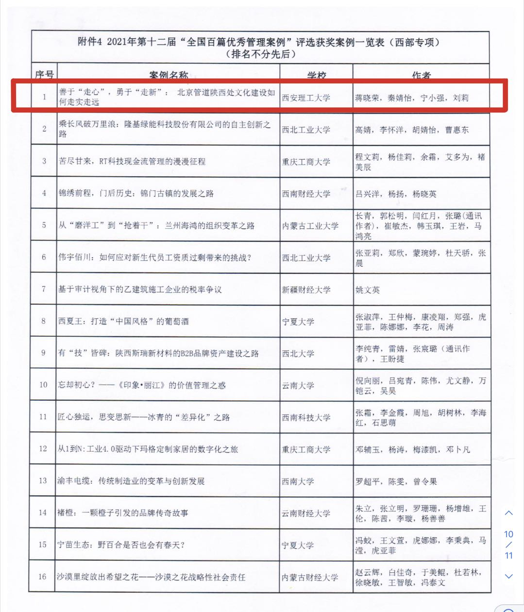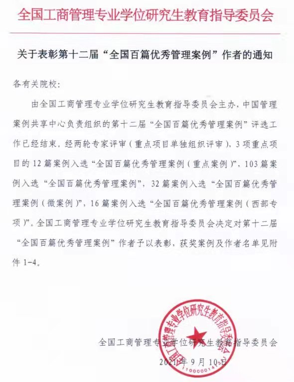 9月10日,全国工商管理专业学位研究生教育指导委员会发布了第十二届“全国百篇优秀管理案例”(简称“百优案例”)入选名单,并对获奖院校及作者予以通报表彰。公司2007so太阳集团蒋晓荣副教授及其团队撰写的案例在激烈竞争中脱颖而出,成功入选第十二届“全国百篇优秀管理案例”(西部专项)。这是蒋晓荣副教授及其团队继入选第十届“全国百篇优秀管理案例”(西部专项)后的再次入选。这次入选标志着公司2007so太阳集团在管理案例研究与开发工作的持续进步,有力地推动公司一流本科和研究生教学及团队建设。