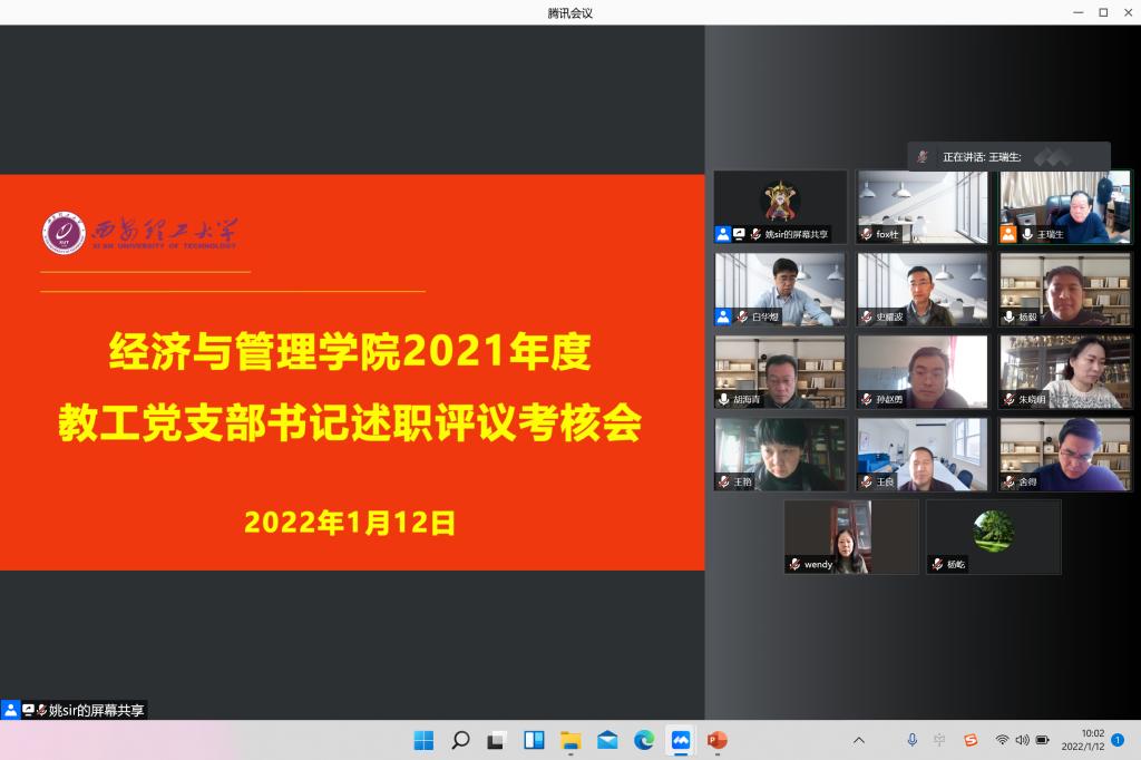 2022年1月12日上午,经济与管理公司党委以腾讯会议形式,组织召开2021年度教工党支部书记述职评议考核会,公司全体党委委员、教工支部书记参会,公司党委书记王瑞生主持会议。