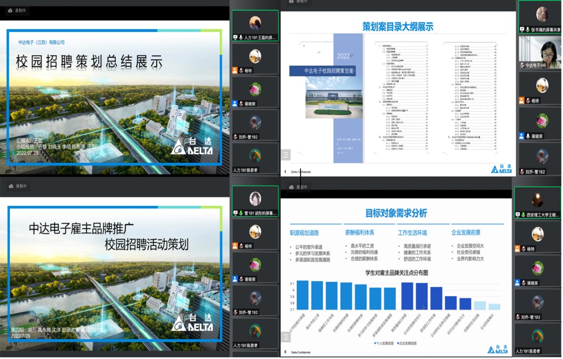 在答辩会上,21名同学分为四组,围绕“作为一名HR您将怎样去策划一场校园招聘?”以及“作为一名HR,您如何在校园招聘的活动中去推广企业的雇主品牌?”这两个主题,对本组制定的策划方案进行汇报,企业导师对每组同学的汇报进行逐一点评。中达电子华东区招聘主管蔡小肖女士认为本次的汇报令她感到惊喜,同学们的策划方案完整、详尽且更贴近当前“00后”的想法,尤其是以王雨欣同学为组长的雇主品牌推广组的方案,可以称为完美交付。她认为整场汇报让企业充分感受到了员工的用心,感受到公司的风采,中达电子欢迎这样优秀的学子来企业就职。