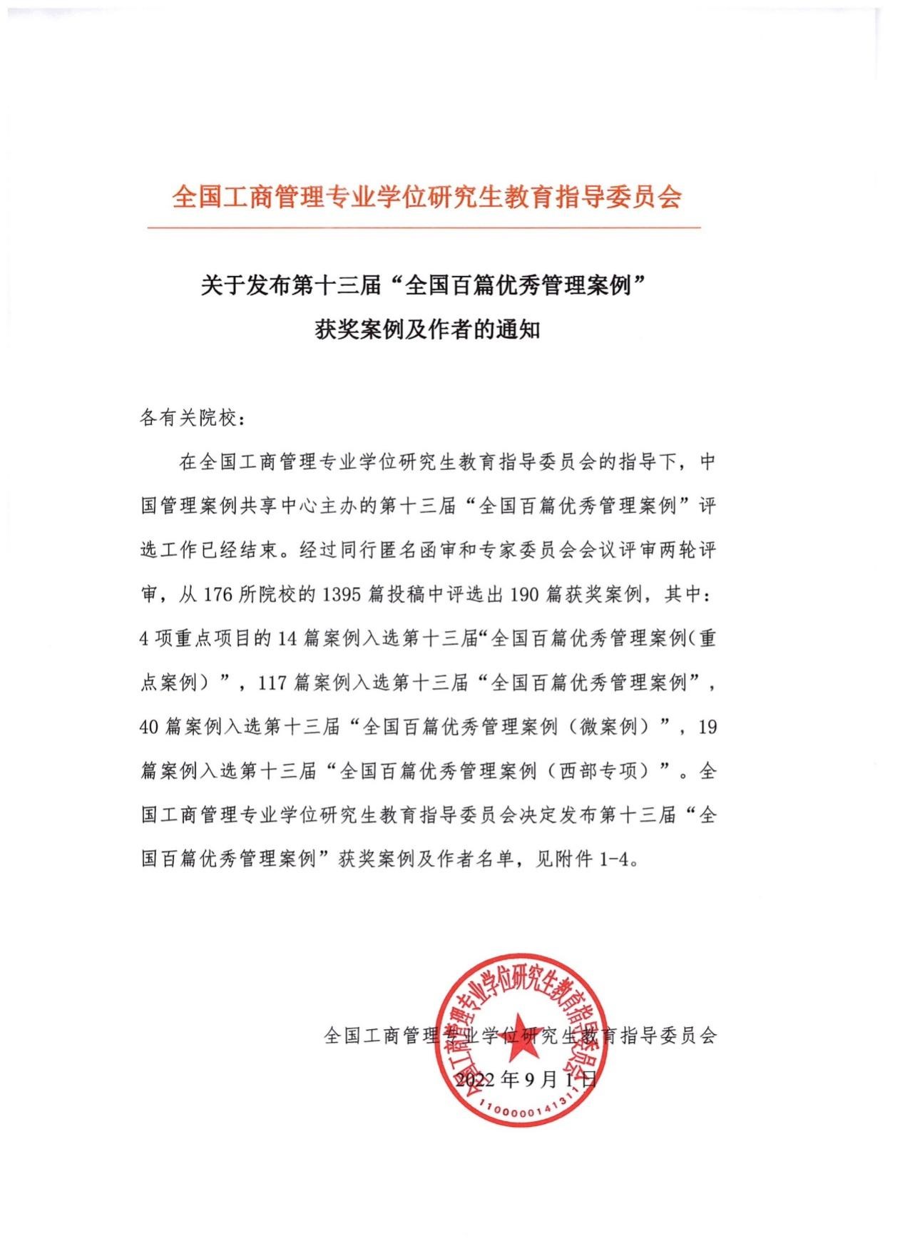 2022年9月1日,全国工商管理专业学位研究生教育指导委员会发布了第十三届“全国百篇优秀管理案例”评选结果。由公司2007so太阳集团蒋晓荣副教授及其团队撰写的一篇案例成功入选第十三届“全国百篇优秀管理案例”(西部专项)。此次入选有助于提高2007so太阳集团在管理案例开发方面的影响力,助推工商管理一流本科和专业学位建设工作。