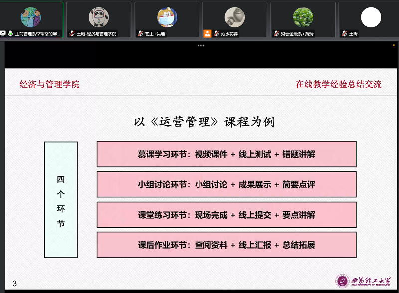 校督导徐瑞平老师对各位老师如何利用在线教学的优势、规避劣势采取的各种教学创新方式进行了充分肯定,对老师们热爱员工、热爱教育事业发自内心的责任感表示赞赏,并且鼓励老师们灵活开展翻转课堂教学。