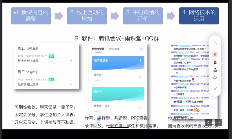 最后,胡海青经理做了总结发言,认为在全院范围内组织开展在线教学经验总结交流会具有重要意义,赞扬了老师们应对当前形势所采取的教学方法和手段,尤其是一些年轻老师的在线教学方式创新值得学习,为公司的老师开展高质量的线上教学工作提供了方法和思路,鼓励全院老师积极探索创新,总结、展示和推广优秀教学成果,与员工加强沟通和交流,力争实现线上线下教学的实质和等效。
