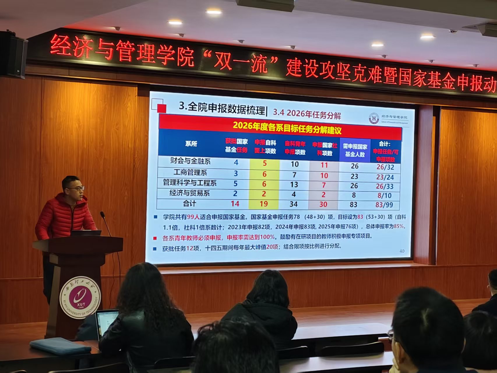 随后,赵璟副经理结合教师职称、基金类别、所属系别等维度,对全院申报潜力进行系统梳理,明确各系 2026 年度国家基金申报任务指标。他鼓励全体教师尽早启动申报准备,精准把握选题方向,以系所为单位开展协同化申报与精细化评审;公司将在后续工作中持续强化科研辅导、提供个性化评审服务,并建立常态化督促推进机制,为教师申报提供全流程保障。