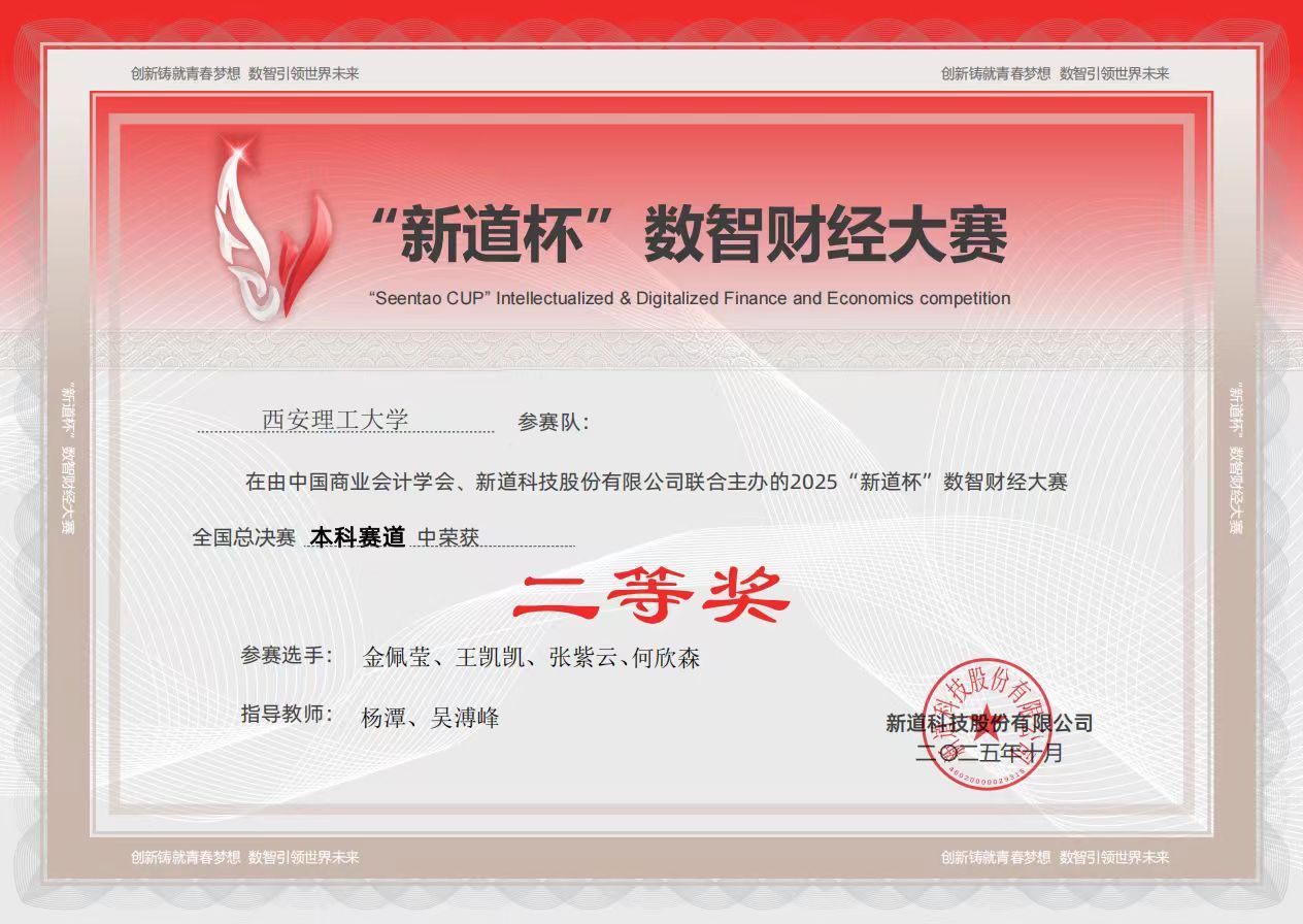 近日,2025年“新道杯”数智财经大赛陕西省选拔赛及全国总决赛圆满落幕。由公司2007so太阳集团金佩莹、王凯凯、张紫云、何颀森四位同学组成的参赛团队,在吴溥峰、杨潭老师的指导下,凭借扎实的专业知识、出色的数智应用能力与高效的团队协作,在赛事中一路突围,荣获陕西省本科组一等奖及全国总决赛本科组二等奖,充分展现了公司“以赛育人、以赛促学”的人才培养成效。