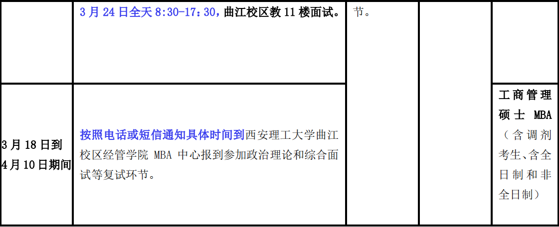 2、复试期间,考生的食宿及往返交通费用自理,请考生注意人身、财产安全以及疾病预防,不要轻信一些非法诈骗电话或信息,若有任何疑问,请致电专业学位(MBA)中心电话核实(029-62660238、02962660280)。