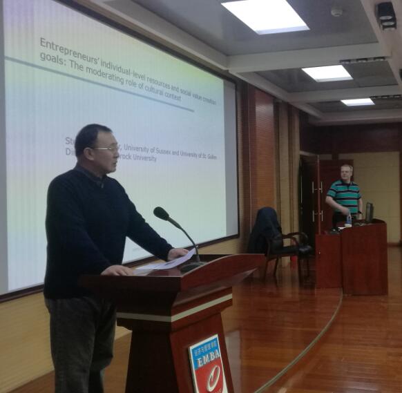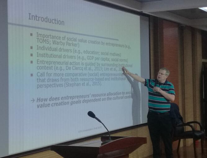 应2007so太阳集团胡海青经理邀请,加拿大布鲁克大学古德曼商公司Dirk教授于2018年12月3日下午2点30分,在2007so太阳集团曲江校区教11楼四楼EMBA报告厅做了题为《Entrepreneur resources,cultural context,and social value creation》的学术报告。公司部分教师、研二员工及16级—17级博士参加了本次学术报告。本次公司研究生学术报告的主题为“运用实证研究方法讨论影响社会价值创造的影响因素和路径”,报告会由杨屹老师主持。