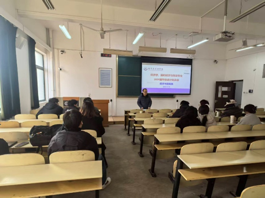 2025年12月29日上午9时,经济与贸易系在9-403教室召开经济学、国际经济与贸易专业2026届毕业设计动员会。会议由系主任向希尧主持,经济学221专业班主任许璐、国际经济与贸易221专业班主任王美霞以及经贸系全体员工参加。部分员工因实习、异地等原因无法到场的同学通过线上会议平台同步参与。经济与贸易系主任向希尧教授首先对毕业设计工作进行全面部署,明确了选题、开题、中期检查、定稿答辩等各环节时间节点,并为经济221班35名同学、国贸221班20名同学逐一分配了指导教师。会上同时宣布建立毕业设计反馈制度,员工可通过指定渠道反馈毕设过程中遇到的问题,以确保工作有序推进。此外,向希尧老师还就论文格式规范、研究方法运用、查重标准等关键事项作了细致说明,并提醒全体员工严守学术诚信,着力提升毕业设计质量。